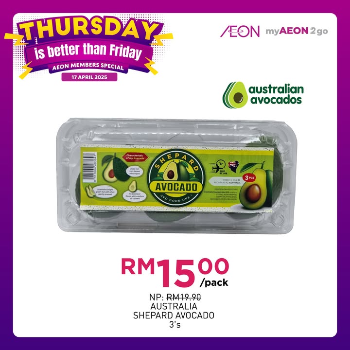 - Avocado Adventure: Indulge in creamy Australian Avocados at just RM15 a pack! Perfect for guacamole, salads, or simply spreading on toast.