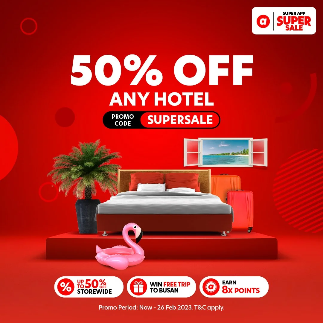 As your preferred Travel Super App in the region, airasia Super App is giving its members 50% off for a wide array of popular and top-rated hotels at exciting destinations such as Kuala Lumpur, Langkawi, Bangkok, Bali, and more throughout the airasia Super App Super Sale with promo code [SUPERSALE].