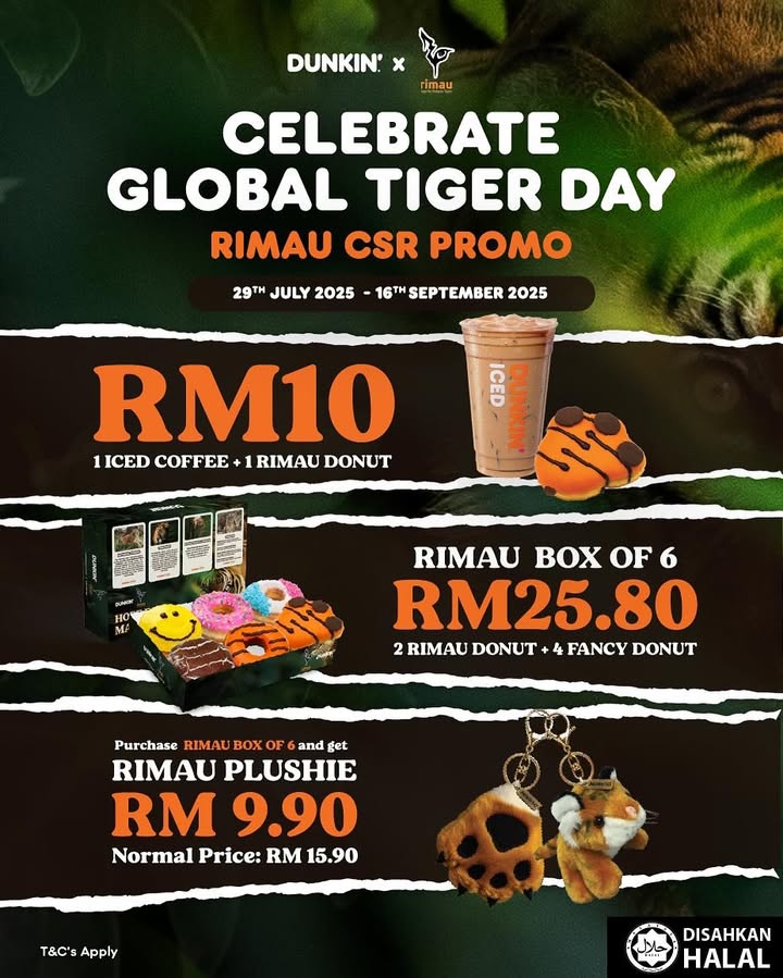 Celebrate Global Tiger Day with Dunkin’’s exclusive promotions and a nationwide CSR campaign supporting Malayan Tiger conservation. Join us on July 29th in Kuala Lumpur or enjoy special deals in all outlets from July 29 to September 16, 2025. Limited-time offers include Rimau Donuts, combo deals, plushies, and more—all contributing to protecting endangered tigers. Visit the store or learn more online and help make a difference!