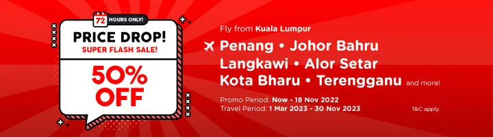 This is your last chance to get 50% off Airasia Super Flash Sale! Book now and fly from Kuala Lumpur to Penang, Johor Bahru and more.