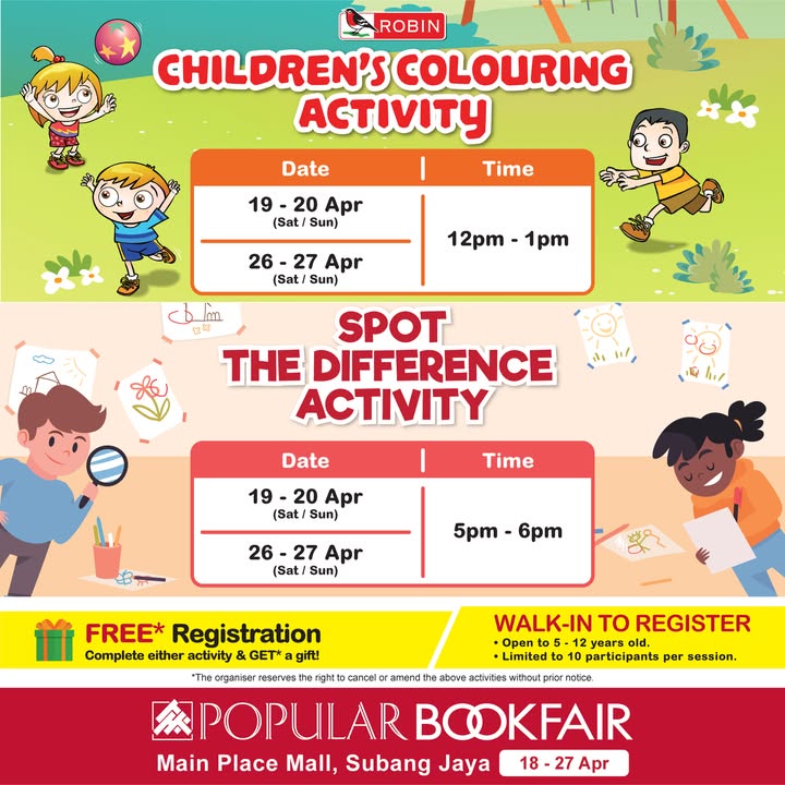 The POPULAR Bookfair will be held at the Ground Floor Concourse of Main Place Mall in Subang Jaya. Mark your calendars for April 18th to 27th, 2025, and prepare for a literary adventure!