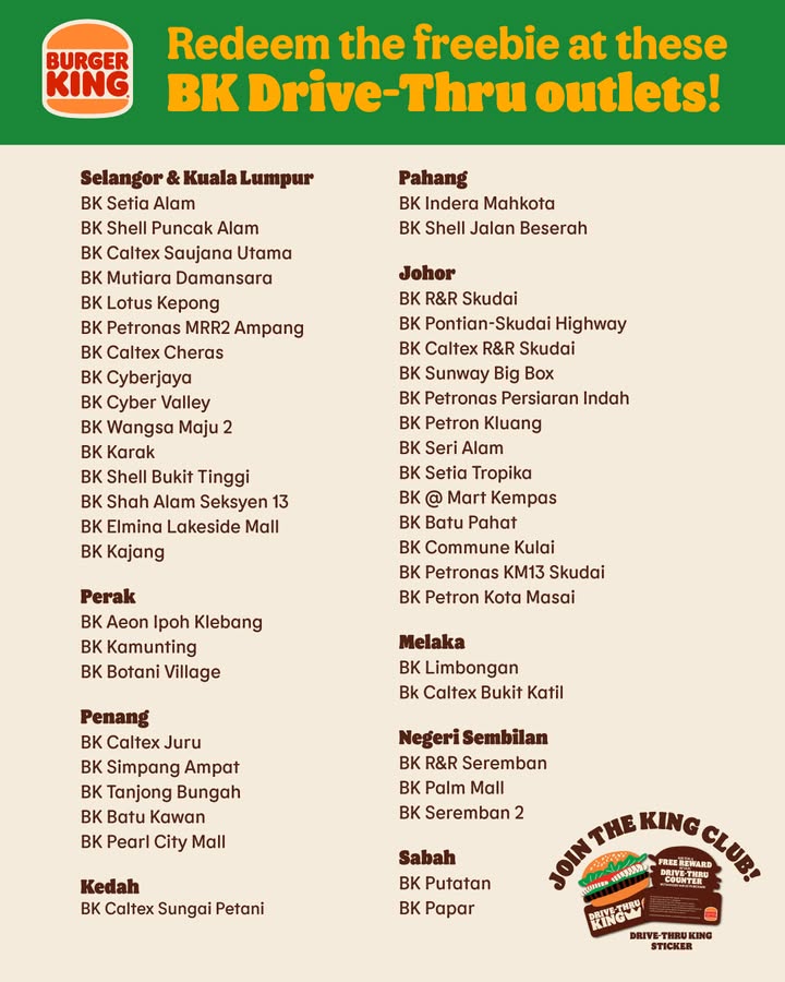 - This deal is exclusive to participating BK Drive-Thru outlets in Malaysia.