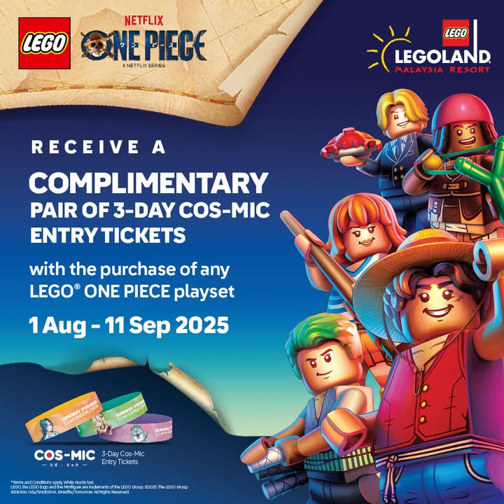 In addition, LEGOLAND Malaysia is running an exclusive promotion on LEGO® One Piece sets. When you purchase any of these sets, you’ll receive FREE CosMIC tickets, giving you access for three days of fun-filled activities at the park. Dive into the adventure, join the crew, and build your own world while enjoying unforgettable moments with friends and family.