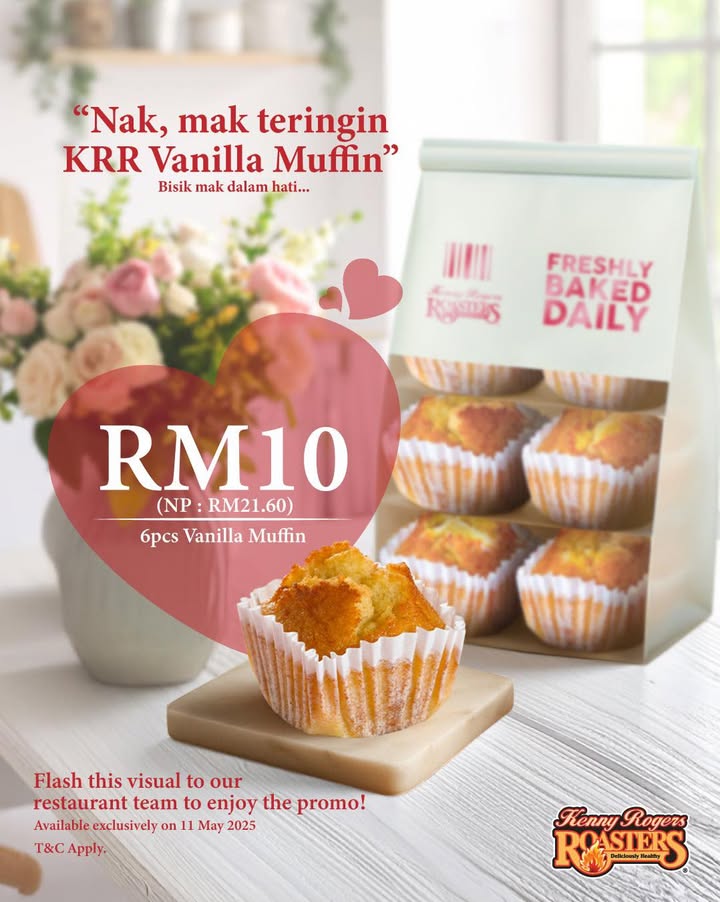 So make this Mother’s Day memorable! Plan a surprise, create a beautiful moment, and indulge her with our special offer. Visit your nearest KRR outlet in Peninsular Malaysia today and treat your loving mother to these delightful Vanilla Muffins for just RM10 for 6 pieces! Remember to act fast because this limited-time promotion won’t last long!