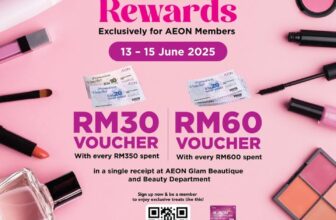 Dive into AEON's Beauty Rewards this June! Spend RM350 and earn a RM30 voucher, or spend RM600 for a RM60 voucher. Limited time only from June 13 to 15, 2025, at AEON Glam Beautique & Beauty ...
