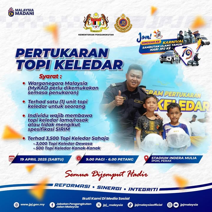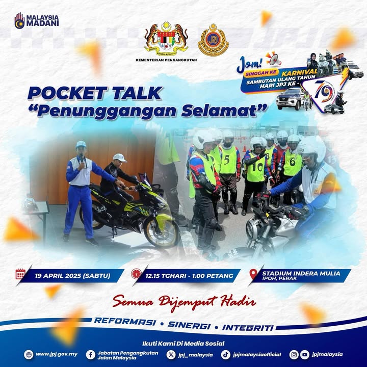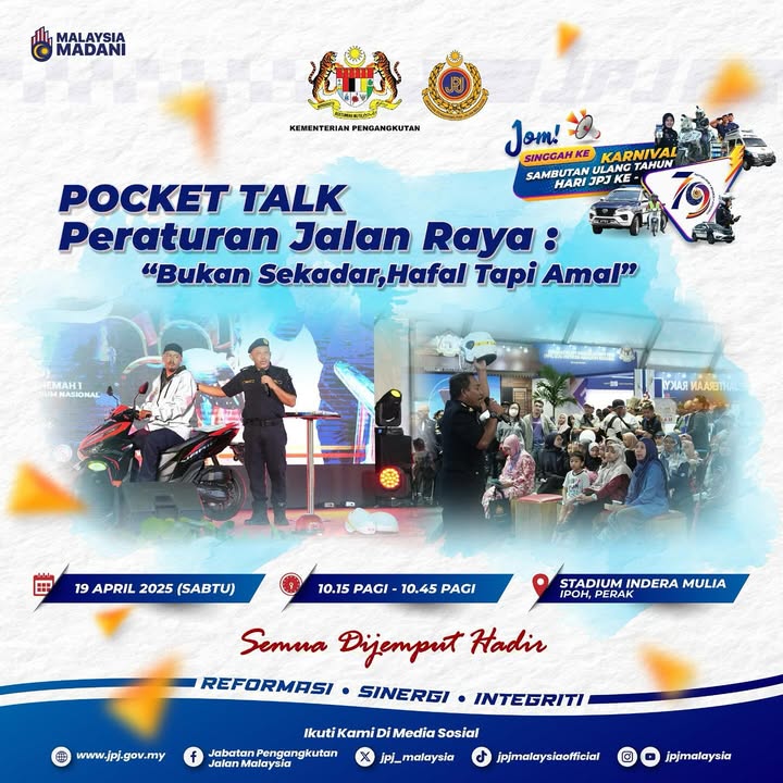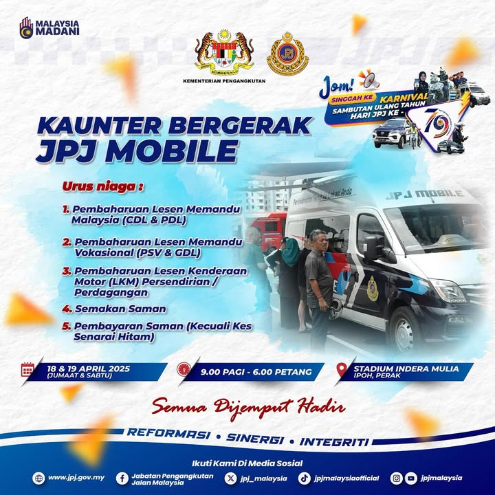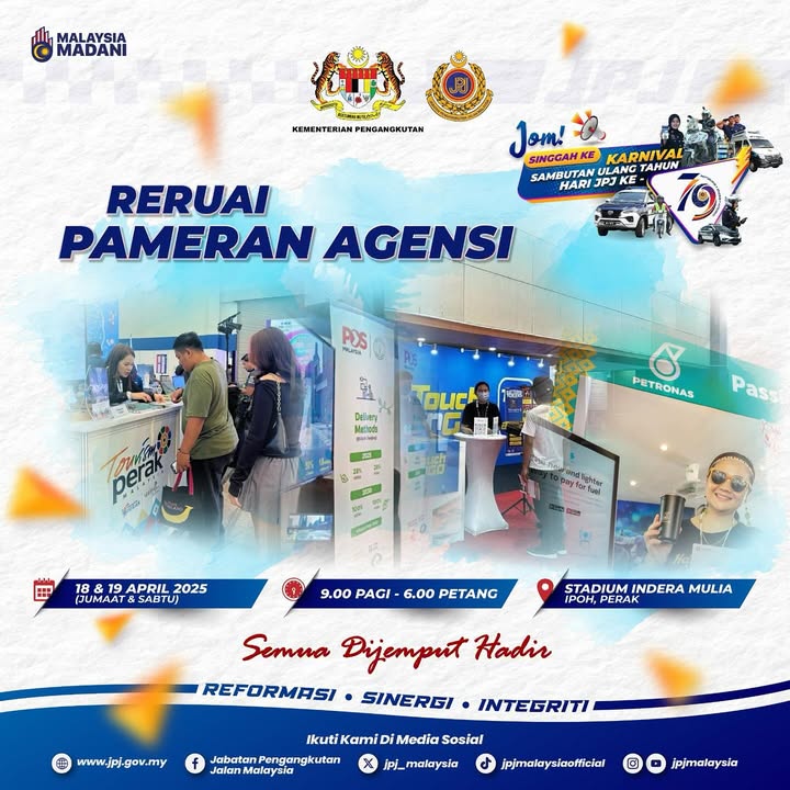 Get ready, Perak folks! The Jabatan Pengangkutan Jalan Malaysia (JPJ) is celebrating its 79th Anniversary with a grand carnival, and you’re invited! Mark your calendars for April 18th and 19th, 2025, and head to Stadium Indera Mulia, Ipoh, Perak for a day filled with exciting activities, informative sessions, and amazing deals. The carnival will be open from 9:00 AM to 6:00 PM on both days.