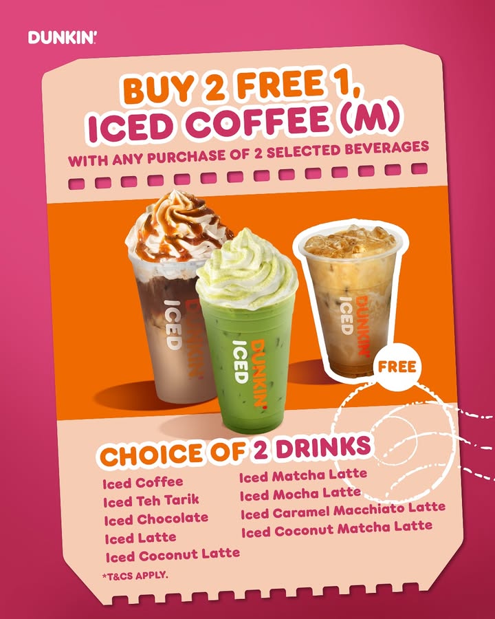 - FREE Iced Coffee: When you purchase two selected iced drinks, you can also snag a FREE medium iced coffee. Choose from a selection that includes Iced Coffee, Iced Teh Tarik, Iced Chocolate, Iced Latte, Iced Matcha Latte, Iced Mocha Latte, Iced Caramel Macchiato Latte, Iced Coconut Latte, and Iced Coconut Matcha Latte.