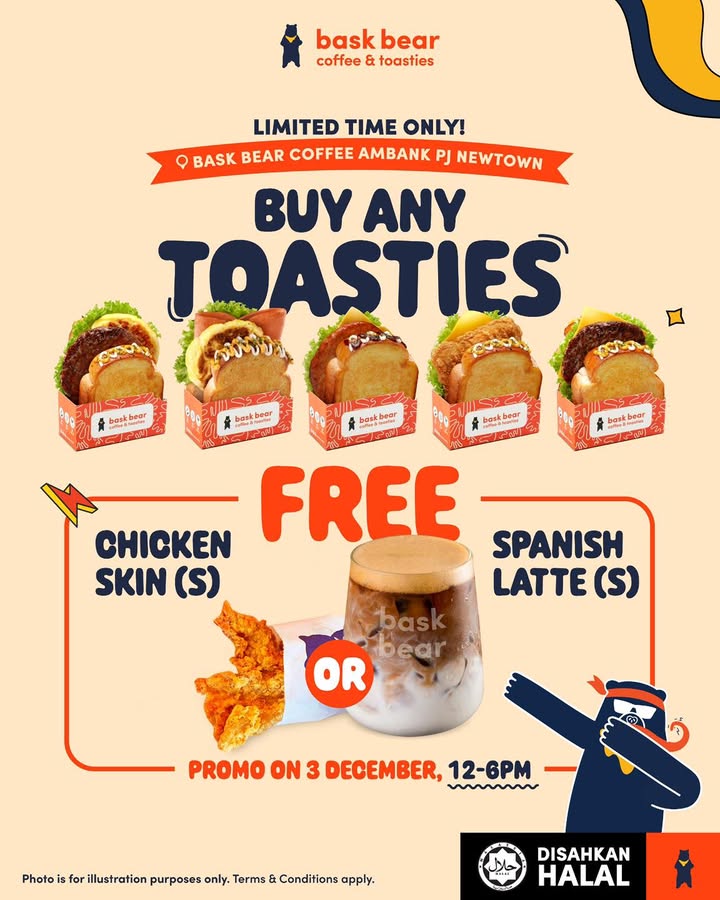 - Walk-in: Simply visit Bask Bear Ambank PJ New Town on December 3rd, order your toastie, and show the promotional poster (shown above) to a Bearista. They will be happy to add your free Chicken Skin (S) or Spanish Latte (S) to your order.