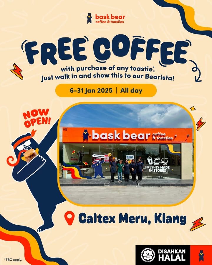 Introduction: Are you a coffee lover looking for a delightful deal? Bask Bear Coffee, a popular coffee shop, is now serving up free coffee with any toastie purchase at their new Caltex Meru location. This exclusive promotion runs from January 6th to 31st 2025 and is a chance to enjoy a great value and a delightful experience. Located conveniently at Caltex Persiaran Hamzah Alang, Meru, Klang, Selangor, Bask Bear’s new cafe offers the perfect place to fuel your day with a tasty treat and fresh coffee. Don’t miss out!
