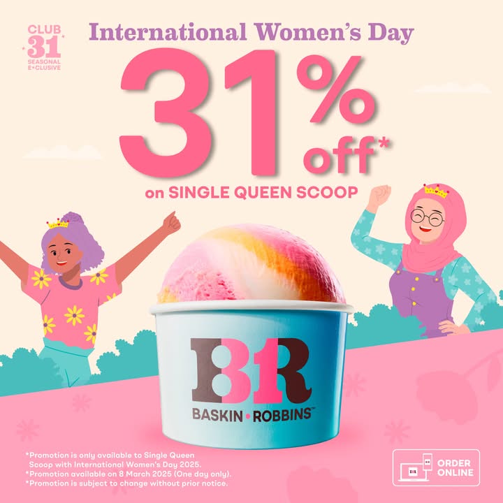 Baskin-Robbins Malaysia is making International Women’s Day a little sweeter this year. Make sure to take advantage of this fantastic 31% off Queen Scoop promotion on March 8, 2025! Download the B-R App and get ready to scoop and enjoy!