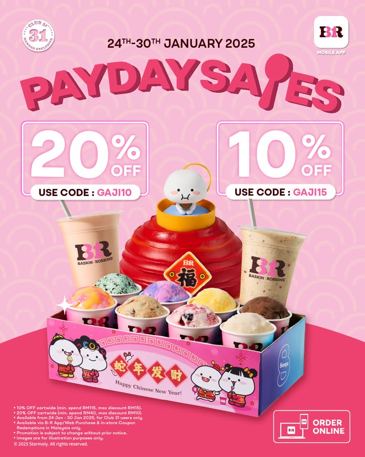 Score up to RM15 OFF by entering promo code GAJI15 during checkout on the B-R App or the Baskin-Robbins website. Alternatively, grab 20% OFF (up to RM10) using the code GAJI10, with a minimum purchase of RM40. Don’t miss this fantastic opportunity to indulge in delightful frozen delights and sweet savings.