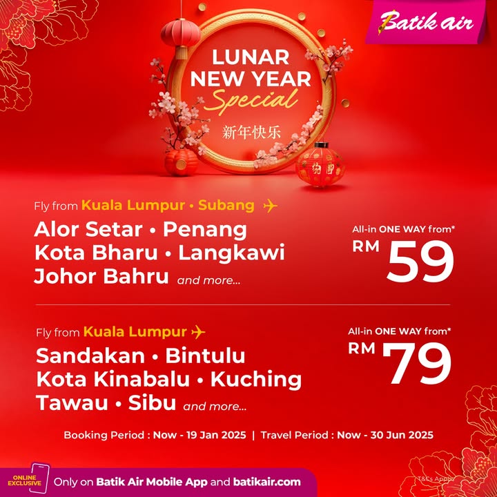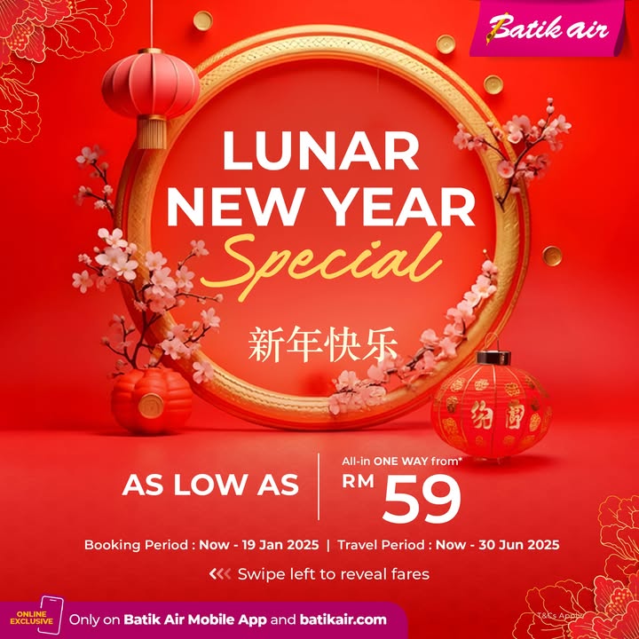 Seize this fantastic opportunity to reconnect with loved ones during the festivities. Secure your tickets with Batik Air‘s Lunar New Year Special fares; they are set to sell out quickly. Plan your reunion now, and make the most of this exclusive offer!