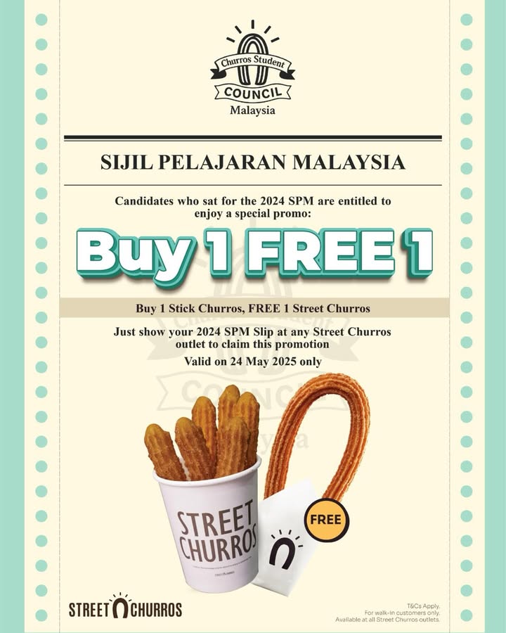 Are you ready for an indulgent celebration? If you’ve conquered your SPM examinations, then you absolutely deserve a reward! Mark your calendars for April 24, 2025, as Street Churros has a sweet deal just for you. It’s a special Buy 1 Free 1 promotion that gives you the chance to savor your favorite churros while sharing the joy with friends. All you need to do is show your SPM slip, and you can relish double the churros and double the fun!