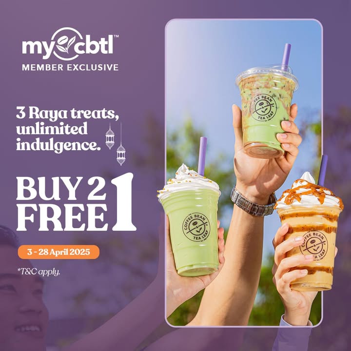 Get ready for a triple dose of deliciousness! The Coffee Bean & Tea Leaf Malaysia is offering an irresistible “Buy 2 Get 1 FREE” deal on select 16oz beverages. This is the perfect opportunity to treat yourself and your friends to a delightful beverage experience featuring rich and exciting flavors. This looks like a limited time offer, so grab the offer as quickly as possible.