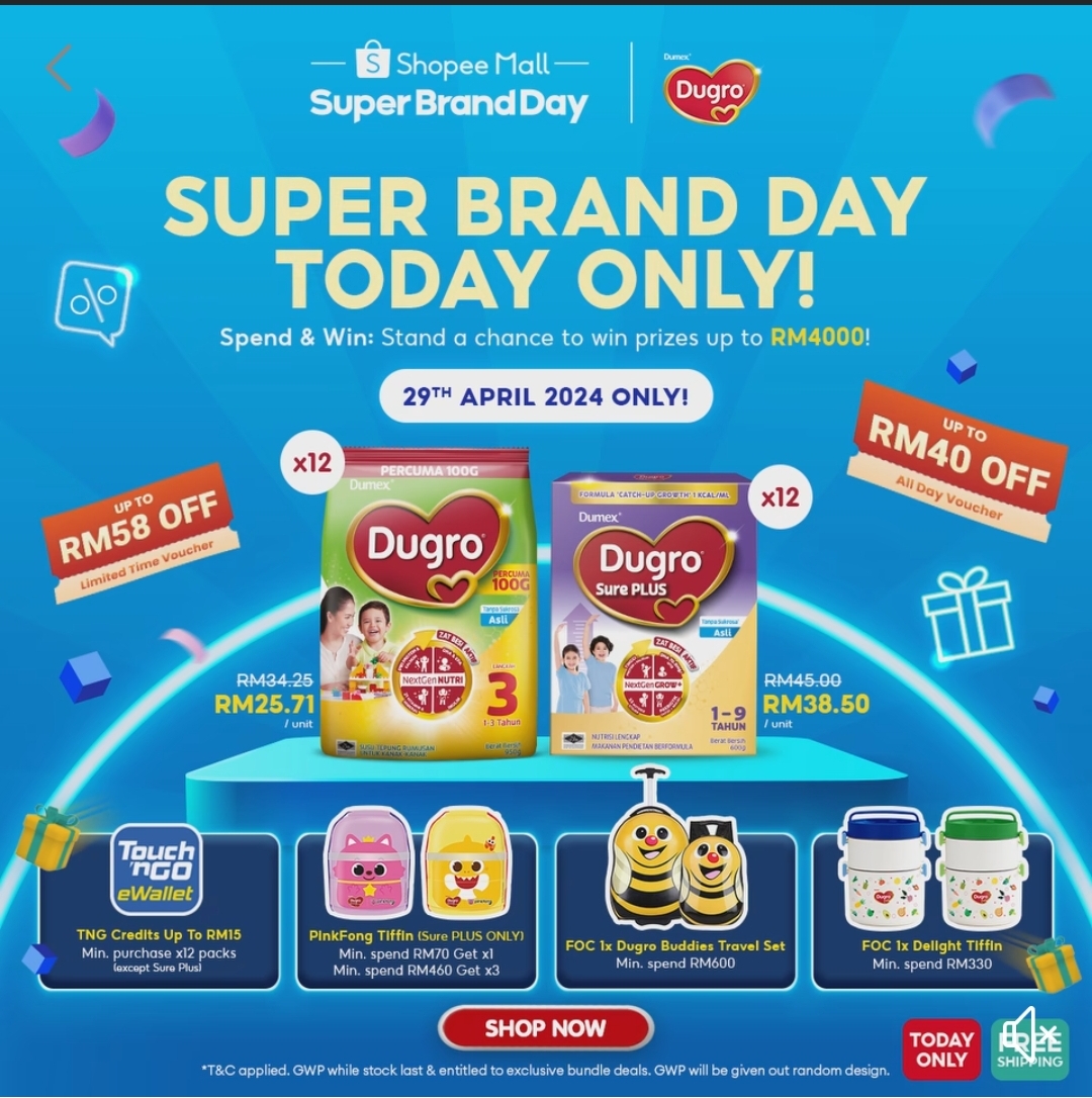 Are you ready for an incredible shopping experience dedicated to your child’s nutrition needs? Look no further than the Dugro Super Brand Day happening exclusively on Shopee this April 29, 2024! Today only, seize the opportunity to grab vouchers worth up to RM58 and double rewards for Si Manja.