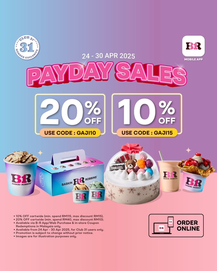 Baskin-Robbins is offering exclusive discounts for Club 31 members from April 24 – 30, 2025. Save 20% off (minimum spend RM40) with code GAJI10 or enjoy 10% off (minimum spend RM115) with code GAJI15. Offers available via app/Web and in-store purchases only in Malaysia. Don’t miss out—grab your ice cream today!