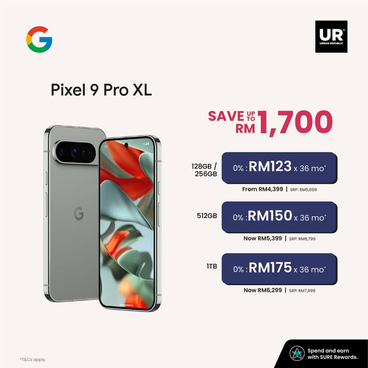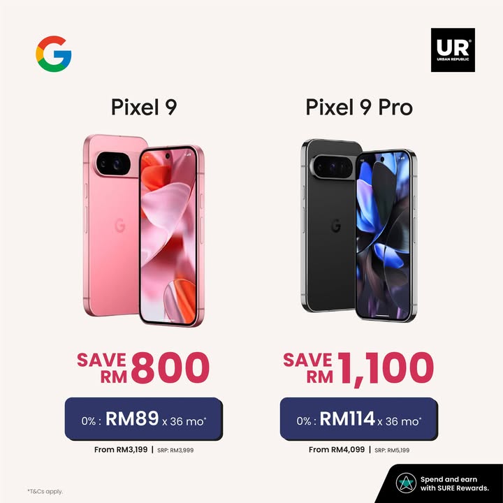 Ready to experience the future of mobile technology? Urban Republic is offering an incredible deal on the new Google Pixel 9 phones, powered by the groundbreaking Gemini AI. This limited-time promotion allows you to save up to RM1,700 on your purchase and take advantage of a 0% instalment plan for up to 36 months! This is your chance to upgrade to a seamlessly smarter experience with the power of Google at your fingertips.