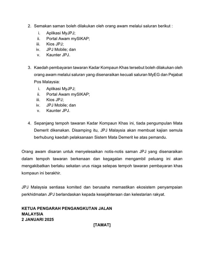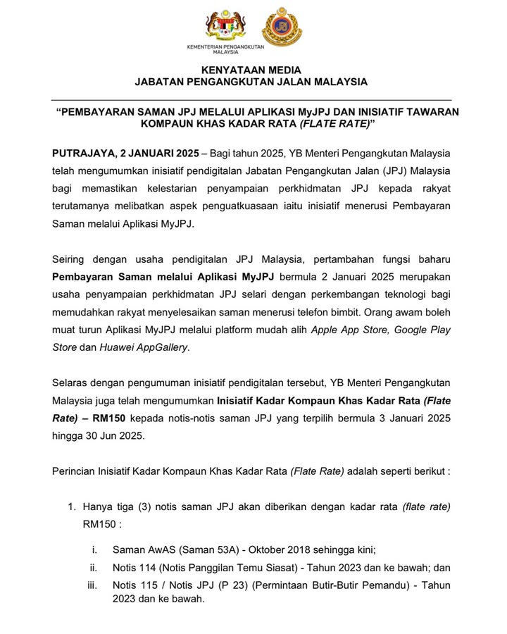For the next six months, from January 3, 2025, to June 30, 2025, JPJ Malaysia is offering a special, discounted, flat rate of RM150 for selected traffic violations. This exclusive offer applies to a limited set of issued notices—don’t miss out on this remarkable opportunity to reduce your fines. Carefully review the criteria for eligibility before applying for this deal.