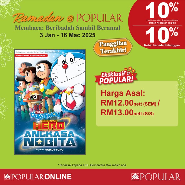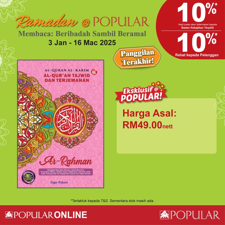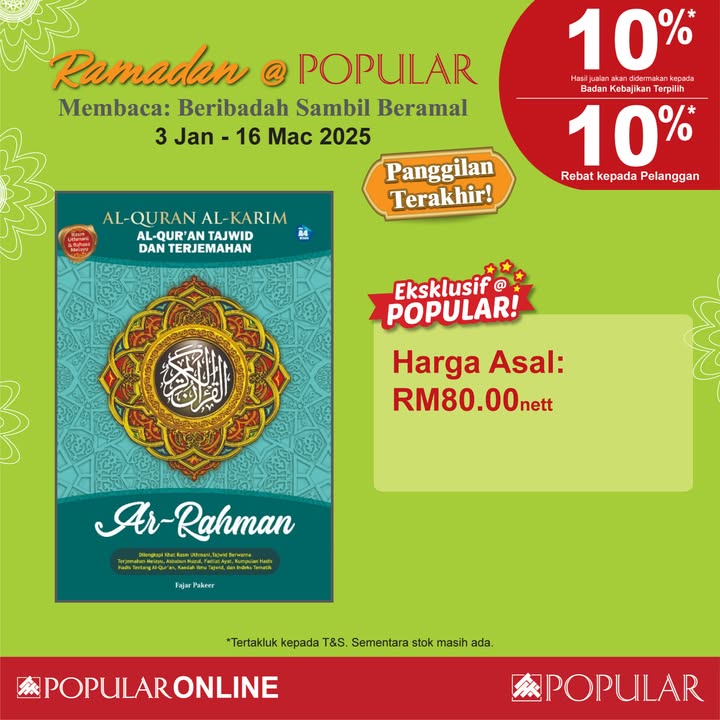 This Ramadan, POPULAR Bookstore provides a fantastic opportunity to combine your love for reading with acts of charity and giving. Whether you’re looking to expand your knowledge, find spiritual guidance, or simply give back to the community, this promotion has something for everyone. Don’t miss out on this chance to enrich your Ramadan experience while making a positive impact on the lives of others. Head to your nearest POPULAR/HARRIS bookstore or visit POPULAR Online before March 16, 2025, to take advantage of these special offers!