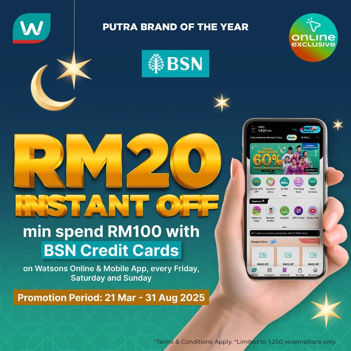 Grab amazing discounts on your favorite health and beauty products! Get RM20 OFF with a minimum spend of RM100 using your BSN Credit Card at Watsons Malaysia. Every Friday, Saturday, and Sunday, you can indulge in your shopping spree and enjoy these fantastic savings! This offer is valid exclusively on the Watsons mobile app and online website. But hurry, the deal lasts until August 31, 2025, and is limited to the first 1,250 redemptions only. So don’t miss out – snag your favorite Watsons products at a steal while supplies last!