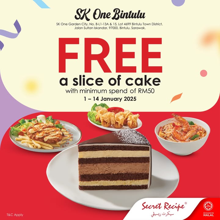 Treat yourself to a delicious, complimentary cake slice at Secret Recipe SK One Bintulu from January 1st to 14th, 2025! Don’t miss out on this limited-time offer and enjoy the sweet experience. Ensure that you review the complete terms and conditions for clarity before you make your purchase.