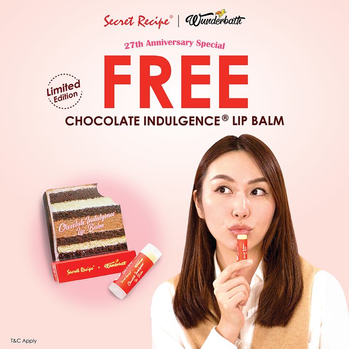 - For Secret Recipe Rewards members: Enjoy a complimentary Wunderbath Co Chocolate Indulgence® Lip Balm with the purchase of any four slices of cake (excluding brownies and chocolate lava cakes). Simply redeem through your member e-voucher.